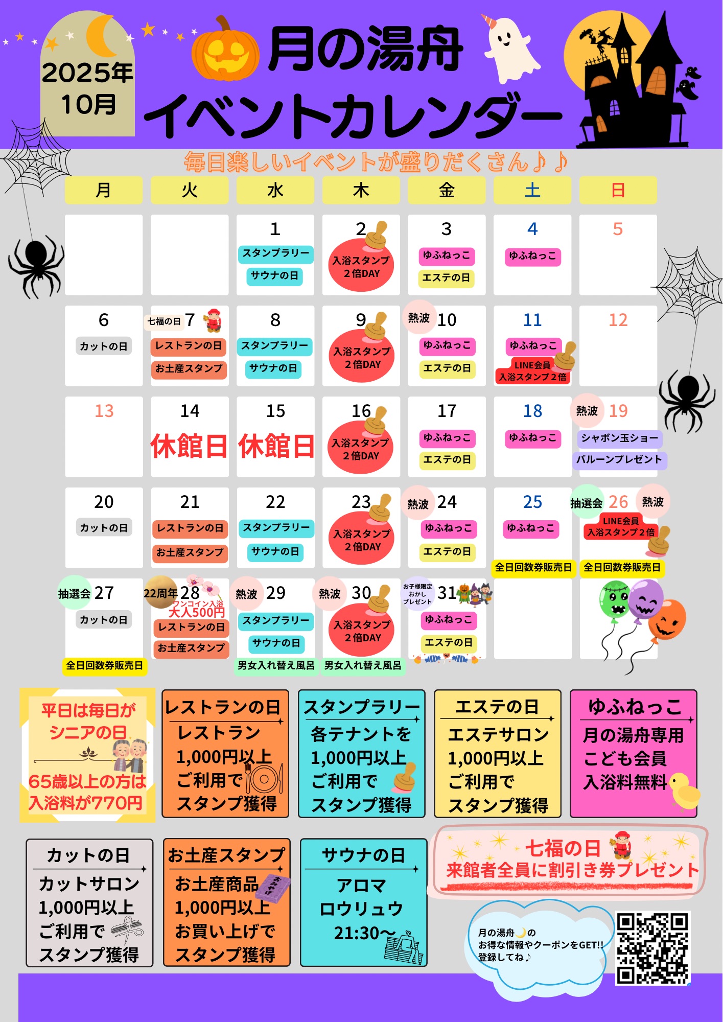 イベント 全23件 2025.10.04 イベント 10月10日は「銭湯の日」♪ レストラン 2025.10.04 イベント 月の湯舟 10月 熱波イベント サウナ 2025.10.03 イベント ハロウィンイベント① 月の湯舟 2025.10.03 イベント 10月28日(火)は入浴料金が500円!? 月の湯舟 2025.10.03 イベント 月の湯舟 10月 キッチンカ―出店 キッチンカー 2025.09.30 イベント 入浴定期券 配布期間 延長決定♪ 月の湯舟 2025.09.29 イベント 月の湯舟 22周年記念 特別イベント レストラン 2025.09.29 イベント 10月 男女入替風呂 開催決定! 月の湯舟 2025.09.29 イベント 10月 イベントカレンダー 2025年 月の湯舟 1 2 3