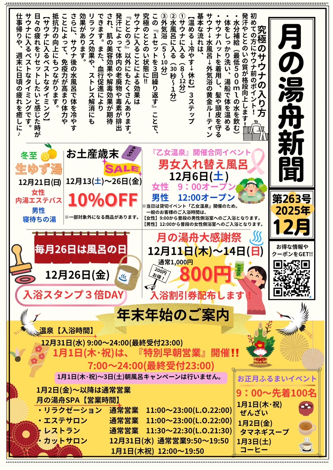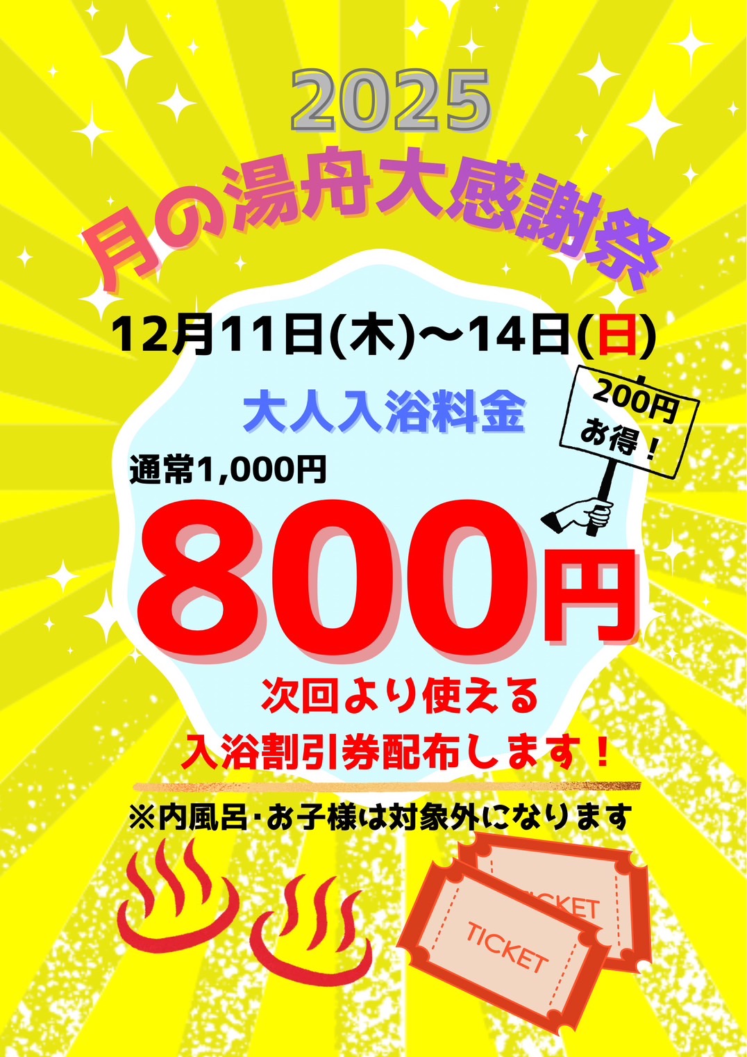 イベント 全60件 2025.11.29 イベント 月の湯舟 お土産品 歳末SALE 12月 月の湯舟 2025.11.28 イベント Lucky Chubbyさん来館!【キッチンカ―】 キッチンカー 2025.11.27 イベント 乙女温泉【特別貸切入浴イベント】 月の湯舟 2025.11.27 イベント 男女入替風呂開催決定!【乙女温泉 合同イベント】 月の湯舟 2025.11.27 イベント お風呂リトリート【健康ヨガ×ストレッチ】 月の湯舟 2025.11.26 イベント 月の湯舟新聞 12月号 2025年 月の湯舟 2025.11.26 イベント 来館者に入浴割引券をプレゼント♡ 月の湯舟 2025.11.26 イベント シャンプー&トリートメントバー プレゼントキャンペーン 月の湯舟 2025.11.17 イベント 米倉商店「よねや」来館!【玄関入口で販売】 月の湯舟 2 3 4