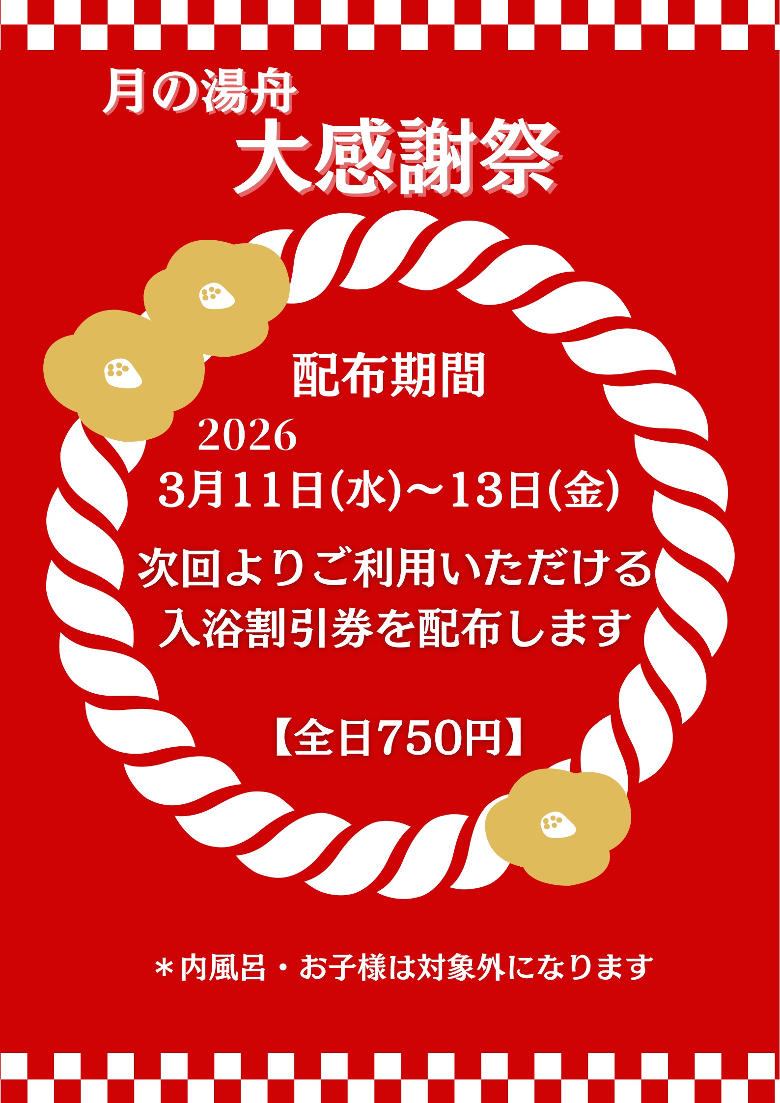 新着情報 全119件 2026.03.01 お得情報 3月クーポン 月の湯舟 2026.02.28 お知らせ 入浴料金改定のお知らせ 2026年3月より~ 月の湯舟 2026.02.28 お知らせ 入浴料金改定のお知らせ 2026年3月より~ 月の湯舟 2026.02.25 お知らせ 朝風呂キャンペーン終了のお知らせ【LINE会員様限定】 月の湯舟 2026.02.23 イベント 熱波イベント3月2026年 サウナ 月の湯舟 2026.02.22 イベント サウナの日限定のサウナ飯♪ レストラン 2026.02.22 イベント サウナの日 素敵洋品さんSALE 月の湯舟 2026.02.22 イベント サウナの日 オロポキャンペーン 月の湯舟 2026.02.21 イベント 毎月恒例 割引券配布キャンペーン 月の湯舟 1 2 3