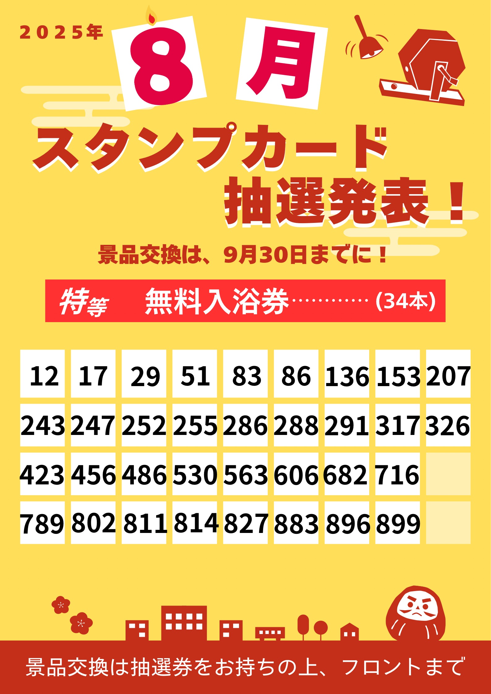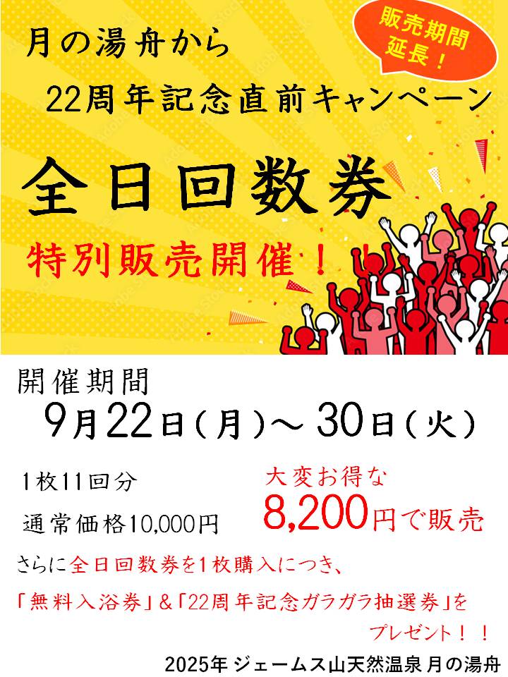 新着情報 全42件 2025.09.12 イベント 月の湯舟 9月 熱波イベント サウナ 2025.09.12 お得情報 タイガースVブラックカレー レストラン 2025.09.12 お得情報 敬老の日 ギフト券販売中! リラクゼーション 月の湯舟 2025.09.12 お得情報 阪神タイガース優勝おめでとう!スタンプ3倍押し! 月の湯舟 2025.09.10 お得情報 オロポ&オロイオンセット220円! 月の湯舟 2025.09.10 お得情報 8月 スタンプカード抽選 当選発表 2025年 月の湯舟 2025.08.31 お得情報 レストラン 期間限定メニュー レストラン 2025.08.27 イベント 月の湯舟 9月 館内イベント 月の湯舟 2025.08.26 イベント 月の湯舟 22周年 直前キャンペーン 月の湯舟 2 3 4